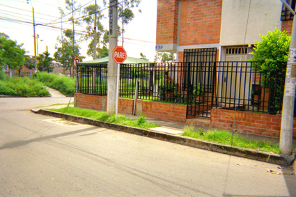 Plano Medio. Imagen tomada en exteriores con luz de flash. En la parte inferior de la imagen se observa una vía pavimentada con una diagonal hacia la izquierda. Sobre ella en una esquina, una vivienda de dos plantas con muros de ladrillo a la vista y un antejardín definido por una cerca metálica.