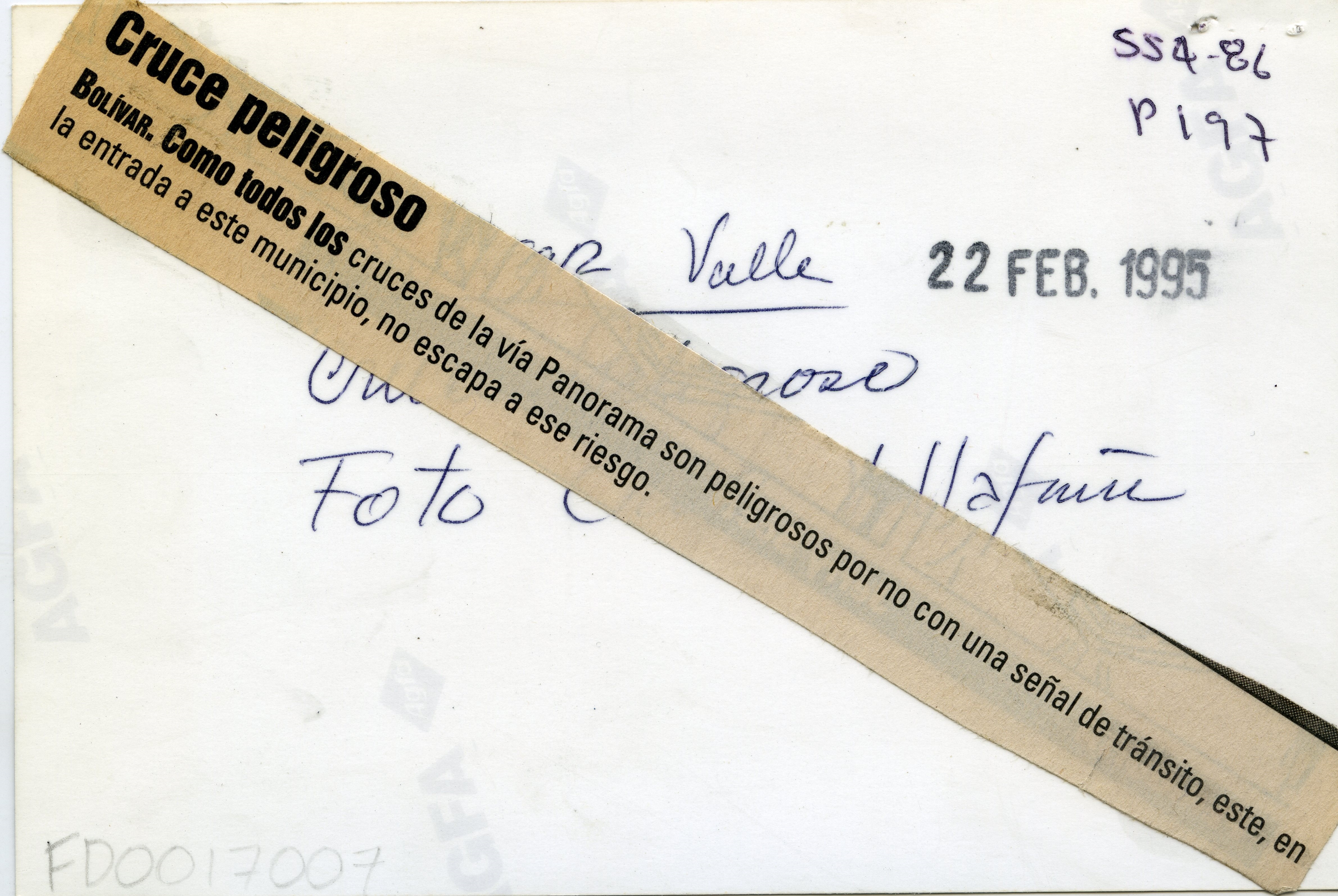 Al reverso de la fotografía se anexa recorte: "Como todos los cruces de la vía panorama son peligrosos por no con una señal de tránsito, este, e la entrada a este municipio, no escapa a ese riesgo."
