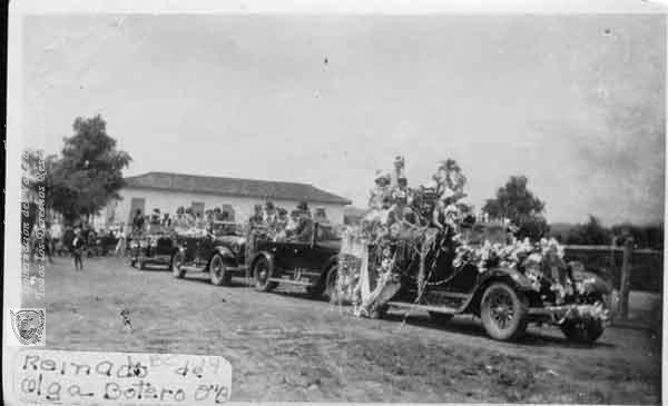 Carnavales en Cartago. Encabeza el automóvil que lleva a la reina señorita Olga Botero. Cartago, 1917.