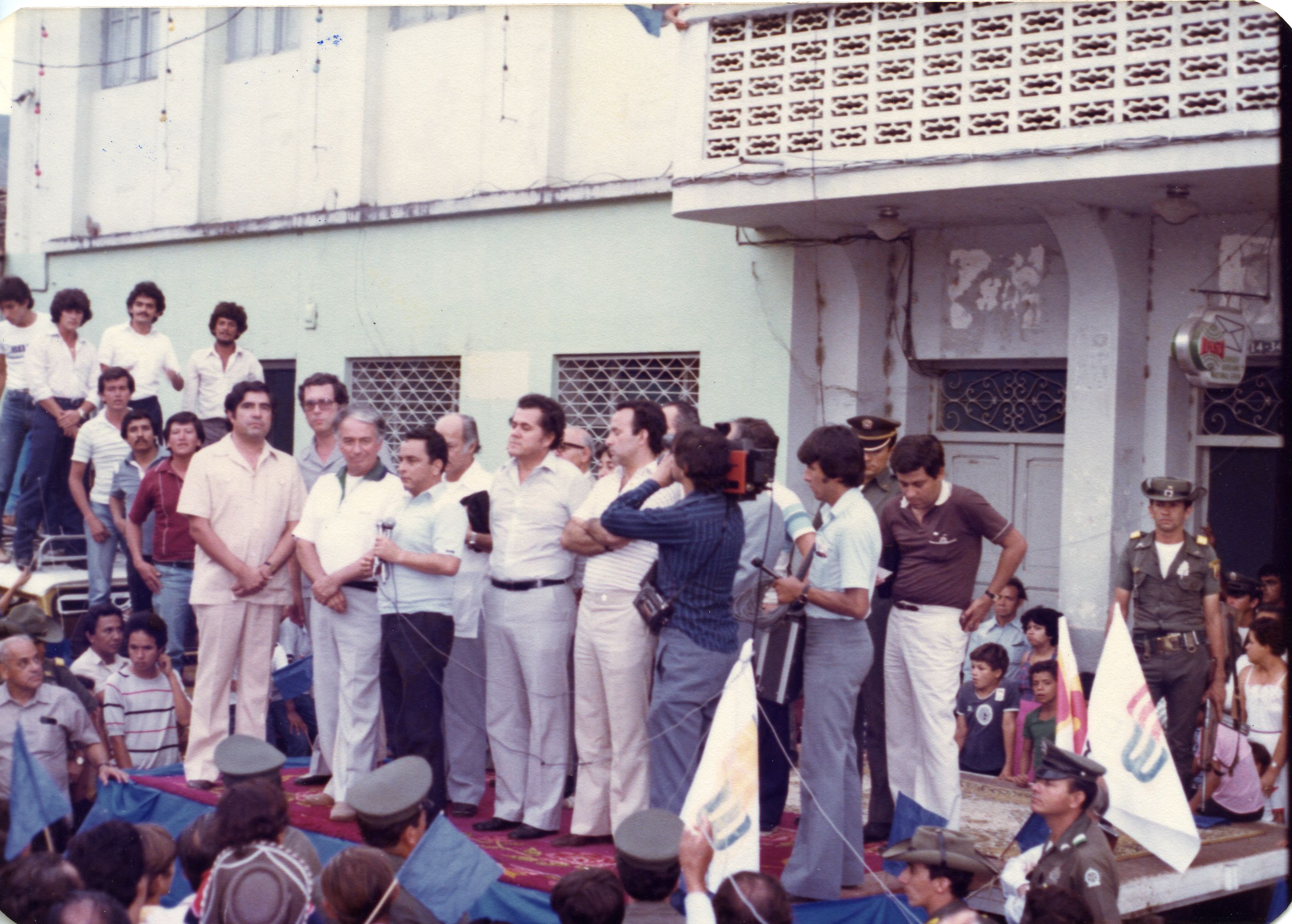 En la fotografía podemos apreciar una de las campañas políticas del señor Carlos Holguín Sardi, quien está acompañado de un gran número de sus seguidores.