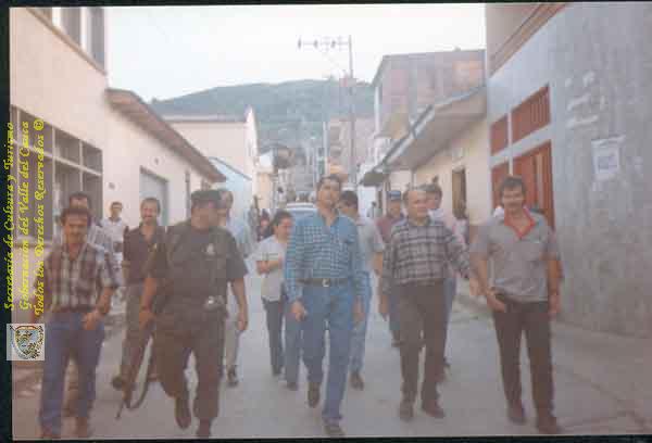 Gustavo Alvarez Gardeazábal, escritor y ex-gobernador del Valle del Cauca, acompañado de los aguileñs Gilder López y Guillermo Castaño. El Aguila, Carrera 3a., 8 de diciembre de 1997.