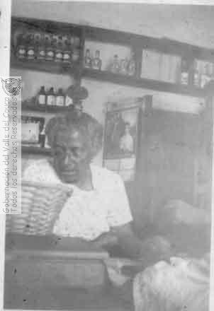 Manuel Mazuera en la tienda de su propiedad en la carrera 14 con carrera 10. Zarzal. Las tiendas y sus dependientes han sido lugares y personajes típicos de la cultura popular de nuestros pueblos. Zarzal. C. 1955