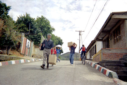 Toma en contrapicado. Exterior día. Toma de familia en trasteo. Primer plano de calle con paralelismo lineal. Ciclista en contraplano asciende cuesta.