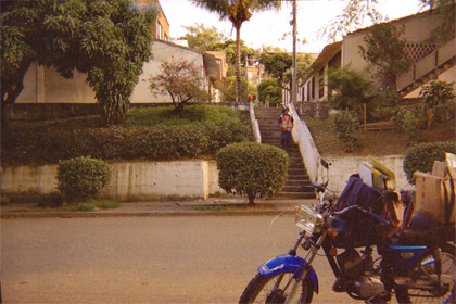 Plano general. en primer plano la moto de un mensajero. En el plano medio el mensajero baja las gradas que comunican la calle con las viviendas.