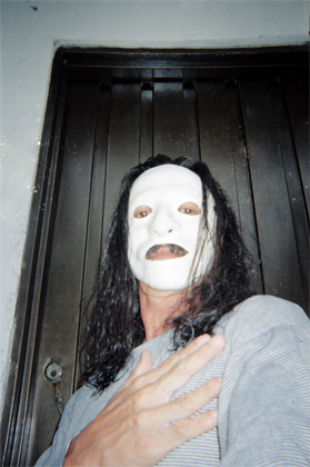 Muñoz Valencia, G. A. (2005). Imagen tomada en interior, donde se puede apreciar un hombre con una máscara blanca con su mano sobre el pecho. Santiago de Cali: Biblioteca Departamental Jorge Garces Borrero.