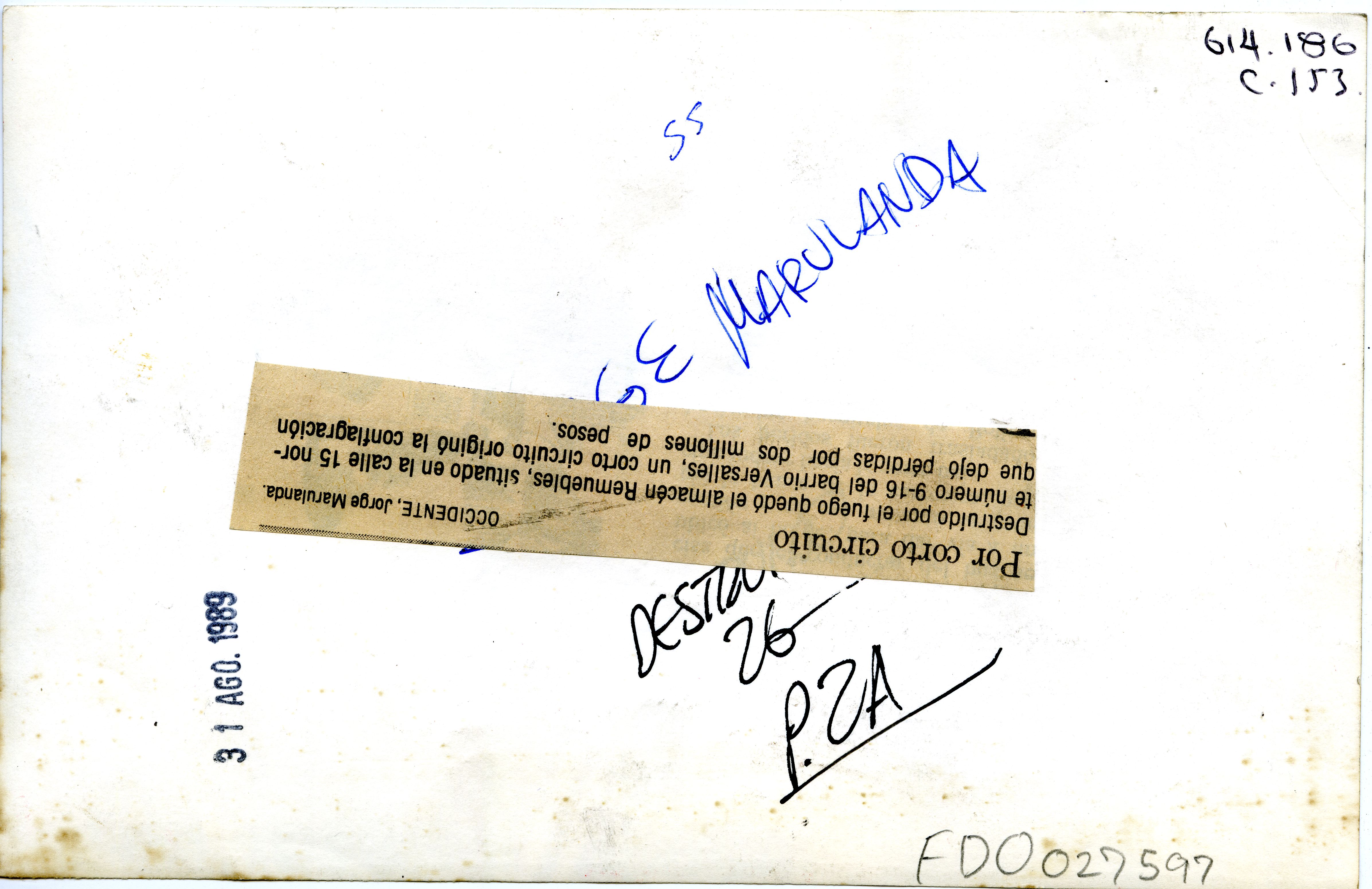 Reverso:" Por coto circuito. Destruido por el fuego quedó el almacén Remuebles, situado en la calle 15 norte número 9-16 del barrio Versalles, un corto circuito originó la conflagración que dejó pérdidas por dos millones de pesos.
