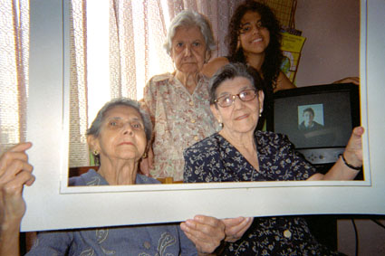 | dc.description | Plano medio. Imagen tomada con luz de flash, en el interior de una vivienda. Se aprecia un grupo de tres mujeres de edad adulta junto a una joven posando para la cámara, junto a ellas un monitor con la imagen de otro miembro de la familia. Con sus manos sostienen un marco de color blanco simulando una pintura. | spa |