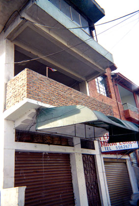 Primer plano de edificación. Contrapicado. Sobredimensión objetual. Realce de parasol en centro de escena. Sobresale banderín tricolor sobre balcón.