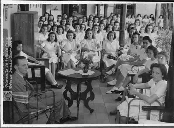 Julio Correa, profesor de historia de la música dictando clases en el corredor del Liceo Benalcázar. Cali. 1941.