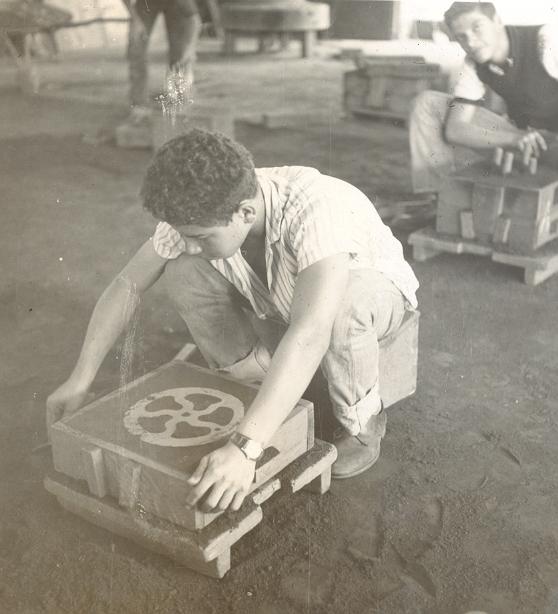 Taller de fundición, estudiantes en práctica del Instituto Antonio José Camacho. Actualmente se conoce como Instituto Educativo Técnico Industrial Antonio José Camacho. Santiago de Cali, fecha aproximada, 1960.