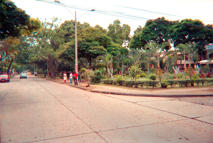 Plano general. Vegetación ornamental en los antejardines de las viviendas en la entrada principal al barrio. Pavimento en regular estado.