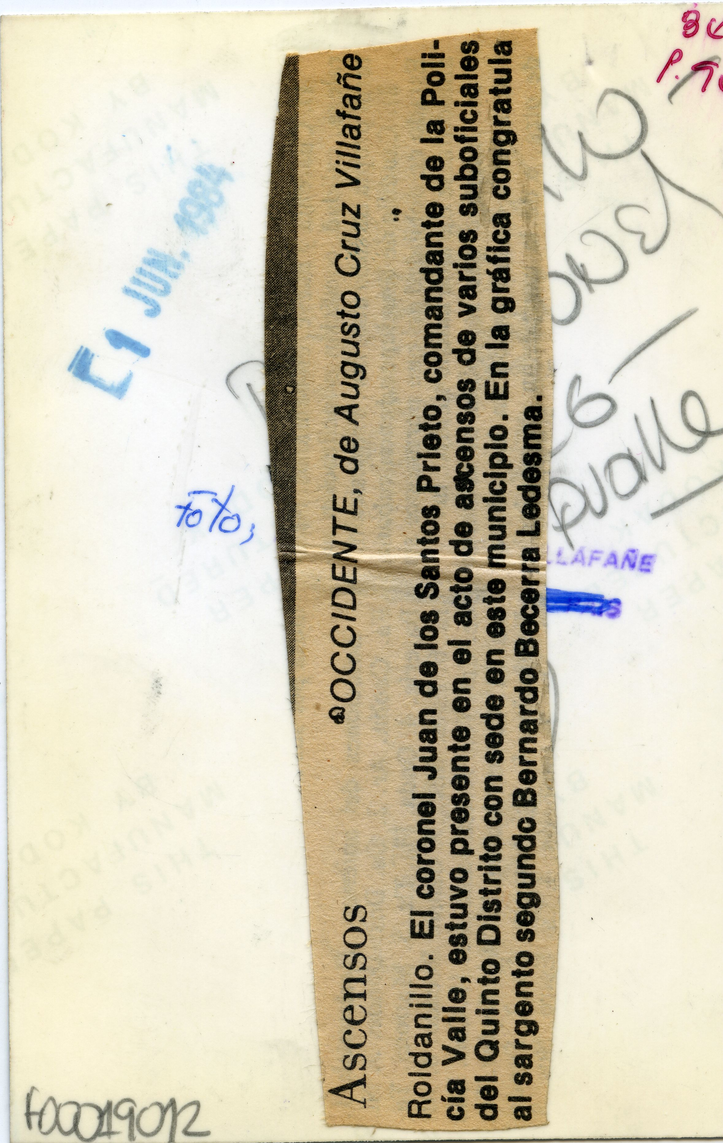 En la fotografía podemos observar al Coronel José de lo Santos Prieto, Comandante de la policía del Valle, participando del evento de ascensos de varios suboficiales del Quinto Distrito del municipio de Roldanillo. Al reverso de la fotografía se anexa recorte: "Ascensos. Roldanillo. El Coronel Juan de los Santos Prieto, comandante de la Policía Valle, estuvo presente en el acto de ascensos de varios suboficiales del Quinto Distrito con sede en este municipio. En la gráfica congratula al sargento segundo Bernardo Becerra Ledesma."