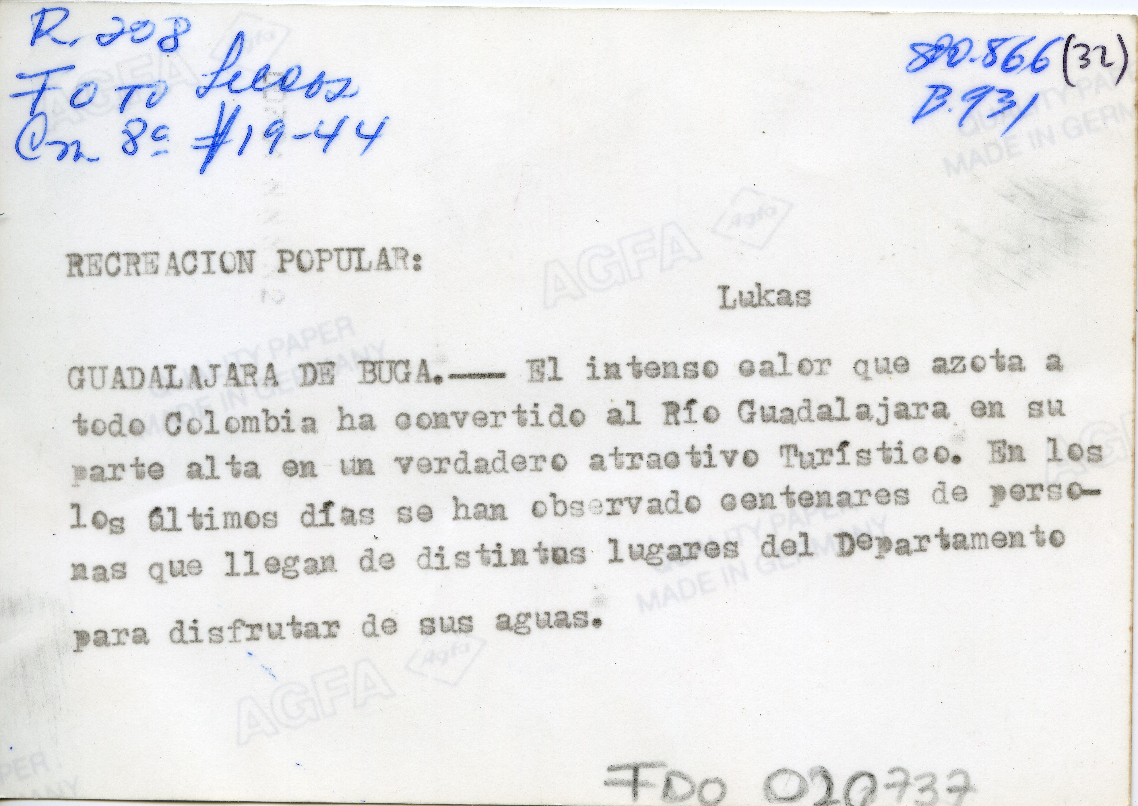 Manuscrito al reverso: Guadalajara de Buga. El intenso calor que azota a todo colombia ha convertido al río Guadalajara en su parte alta en un verdadero atrativo turístico.En los últimos días se han observado centenares de personas que llegan de distintas lugares del departamento para disfrutar de sus aguas