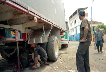Un mecánico se encuentra reparando un camión. Otro observa. Al lado derecho se acerca un hombre con extintores en sus manos. Al fondo bus y edificaciones. plano general. Exterior día.