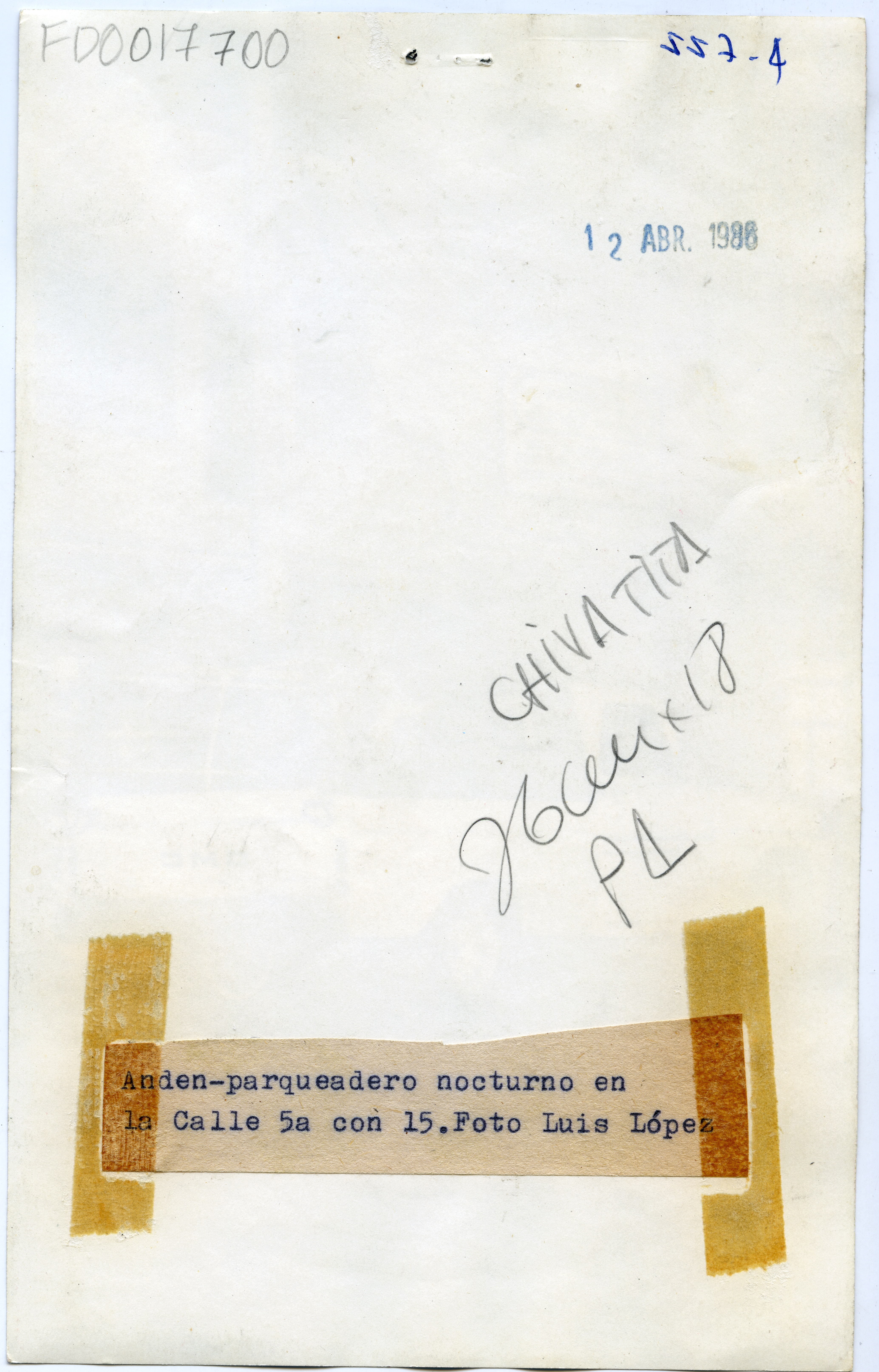 | dc.description.abstract | Al reverso de la fotografía se anexa recorte:" Anden-parqueadero nocturno en la calle 5 con 15". | spa |
