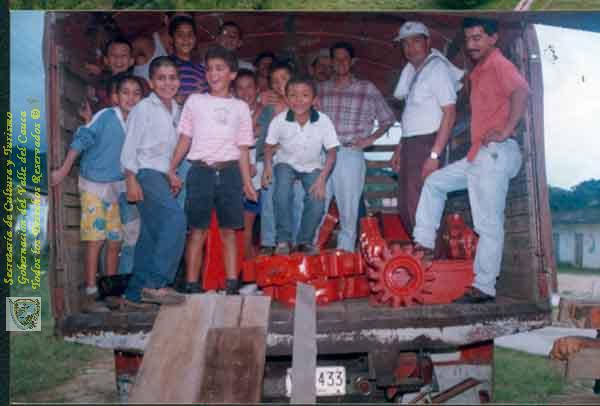 Mark Lundy y Carlos H. Hernández, hijos de los asociados del trapiche comunitario, transportando maquinaria. Versalles, 15-09-1996.