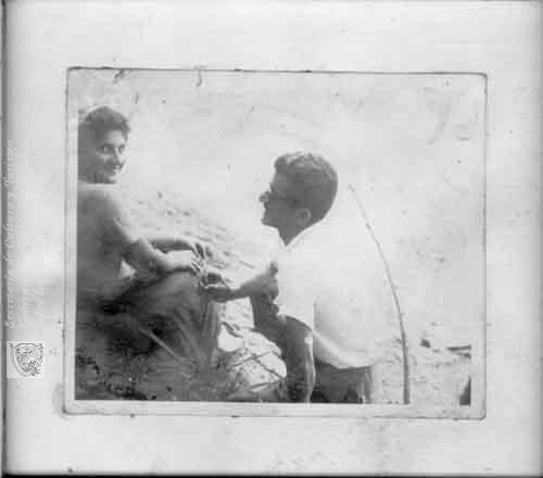 Obsérvese la moda masculina de época, en la camiseta y gafas de Luis Quintero