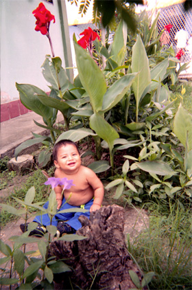 Plano general. Niño mirando a la cámara sonriente. Vegetación dominando el plano.