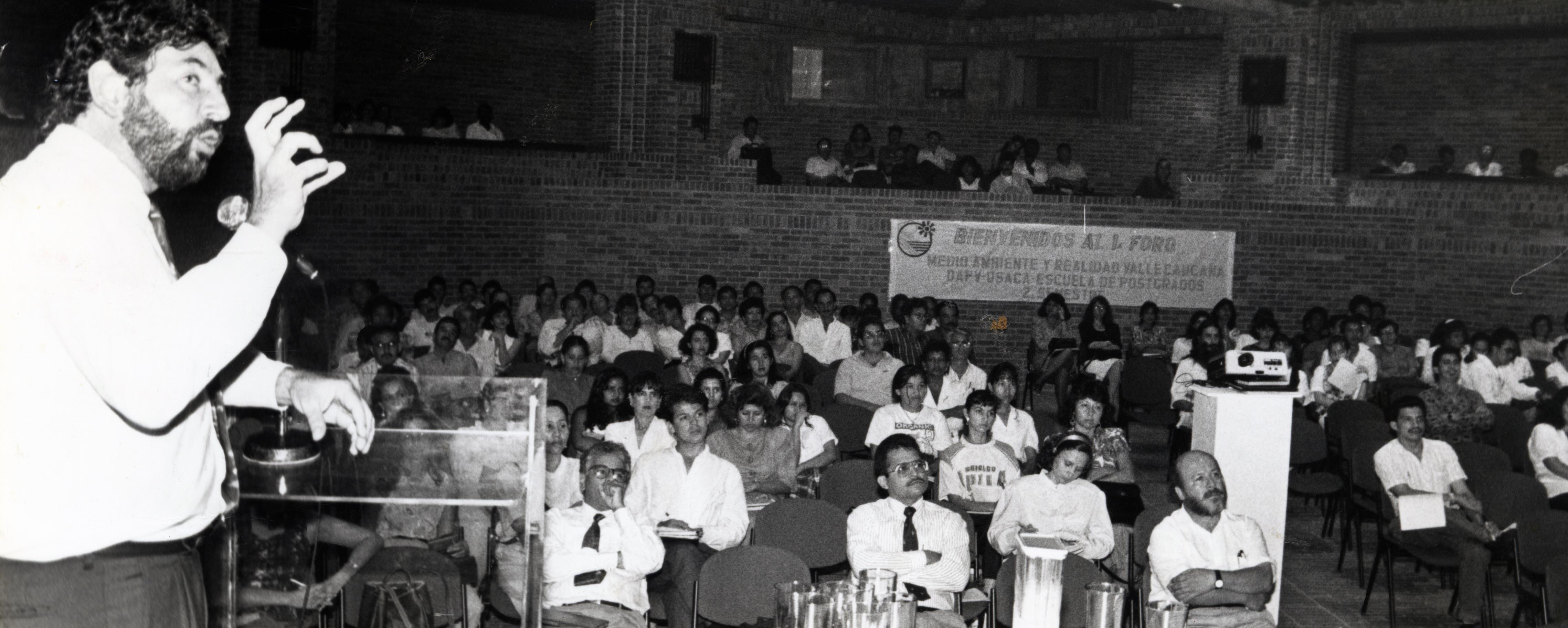 En el pie de pagina dice lo siguiente: El director de Planeción Departamental, Rubén Olarte Reyes, expuso el Plan Maestro de agua para el Valle del Cauca y un diagnóstico completo sobre la realidad actual del manejo de este recurso en la región durante el foro" Medio Ambiente y Realidad Vallecaucana" realizado en la Sala de Conferencias de la FES. El evento fue promovido por la Escuela de Posgrados de la Universidad Santiago de Cali y el Departamento Administrativo de Planeación del Valle--- El Archivo del Patrimonio Fotográfico y Fílmico del Valle del Cauca es responsabilidad de la Biblioteca Departamental del Valle Jorge Garcés Borrero, por convenio de cooperación suscrito con la Secretaria del Cultura Departamental, con el fin de aunar esfuerzos para su conservación, preservación y divulgación del Archivo entre la comunidad Vallecaucana, especialmente entre los estudiantes e investigadores que visitan la Biblioteca, propiciando el su uso y consulta permanente. La universidad Icesi es un colaborador en el proceso de difusión, facilitando la tecnología que permite la consulta de las imágenes.
