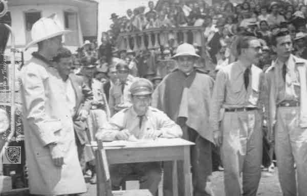 Sentado, Marino Quintero Paz(Alcalde), Padre Díaz, Dr. Echeverry Mesa, en ceremonia del Cuerpo de Bomberos.