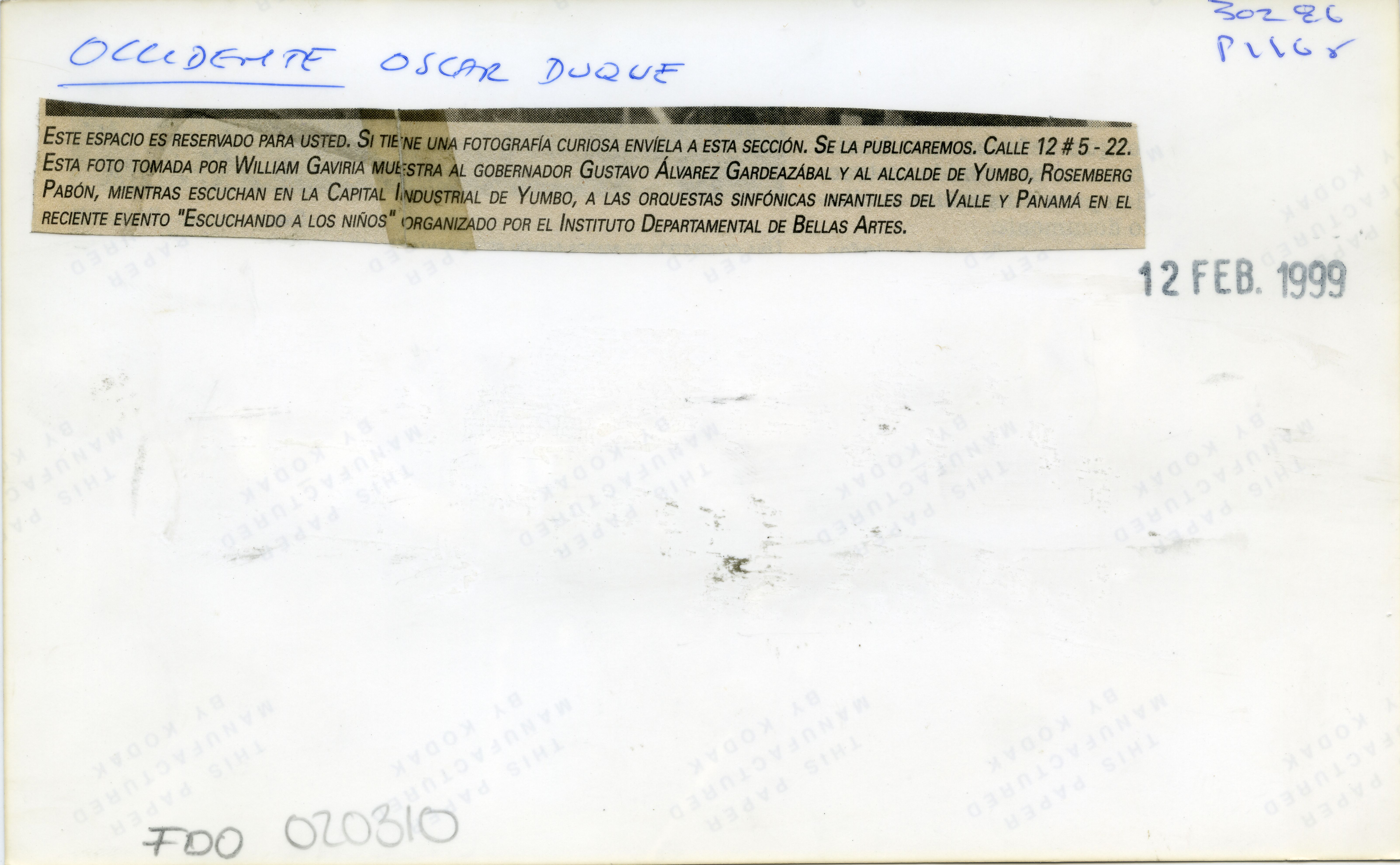 En la fotografía podemos observar al gobernador Gustavo Álvarez Gardeázabal junto al alcalde de Yumbo, Rosemberg Pabón Pabón, en un evento social llamado "Escuchando a los niños" que se llevó a cabo en la ciudad industrial. "Al reverso de la fotografía se anexa recorte: ""Este espacio es reservado para usted. Si tiene una fotografía curiosa envíela a esta sección. Se la publicaremos. Calle 12 #5-22. Esta foto tomada por William Gaviria muestra al gobernador Gustavo Álvarez Gardeázabal y al alcalde de Yumbo, Rosemberg Pabón, mientras escuchan en la capital industrial de Yumbo, a las orquestas sinfónicas infantiles del Valle y Panamá en el reciente evento "Escuchando a los niños” organizado por el Instituto Departamental de Bellas Artes."