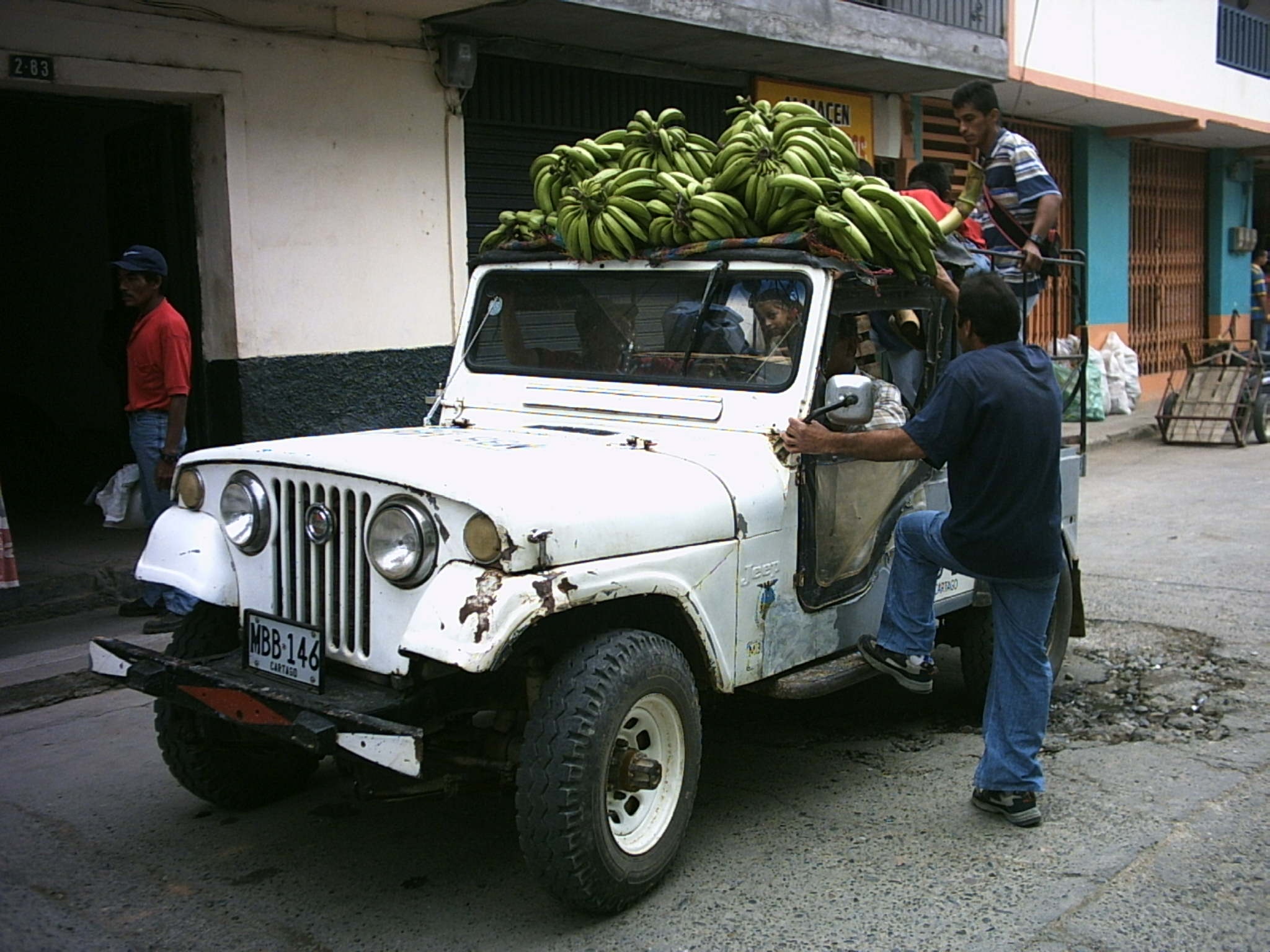 Ansermanuevo, Valle del Cauca. Fundado 15 agosto de 1539, por el Mariscal Jorge Robledo, Se convirtió en municipio por ordenanza 29 de abril de 1925. Observamos jeep willys cargado con plátanos. Se aprecia varias personas