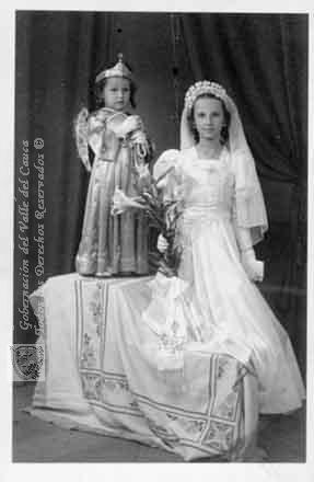 Primera comunión de la niña Fanny Victoria Borja, acompañada de su hermanita Alicia. Para la religión católica la Primera Comunión es el recibimiento de Cristo en el alma. Por eso siempre ha sido un acto donde se invoca la pureza vistiendo de blanco, y se porta un ramito de lirios que son las flores de la virgen. Bugalagrande. 1941.