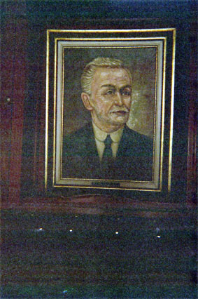 Plano medio. Toma cerrada. Interior colegio. Óleo de Pedro Antonio Molina, gobernador vallecaucano. Detalle de marco dorado resplandeciendo en escena donde predomina sombra.