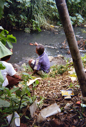 Contraplano. Exterior día. Niños como puntos distintivos señalando caños. Realce de guadua inclinada en costado derecho. Contraste de vegetación sobre basura.