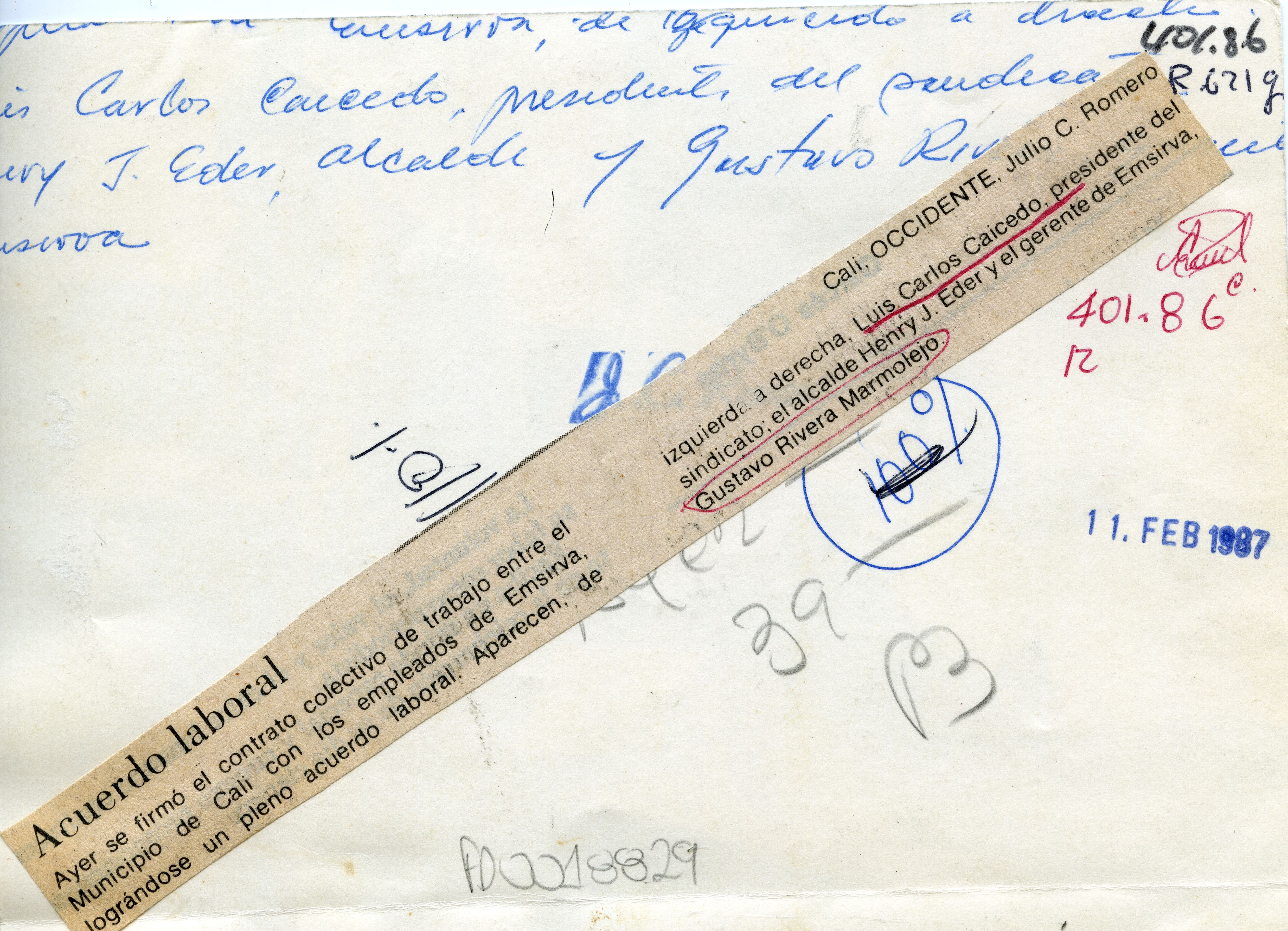 Luis Carlos Caicedo, Henry J. Eder , Gustavo Marmolejo, firmaron contrato colectivo de trabajo el Municipio y Emsirva