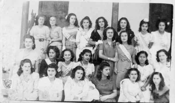 Los reinados de bellaza hacen parte de la indiosincracia colombiana. aquí observamos a las estudiantes de la Escuela Manuel Desiderio, en el reinado estudiantil. Versalles, 1950.