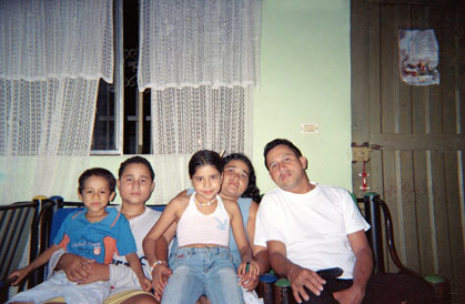 Plano medio. Interior noche. Toma frontal. Retrato familiar en sala, sobre superficie verde. Escenificación. Diversidad en las expresiones.