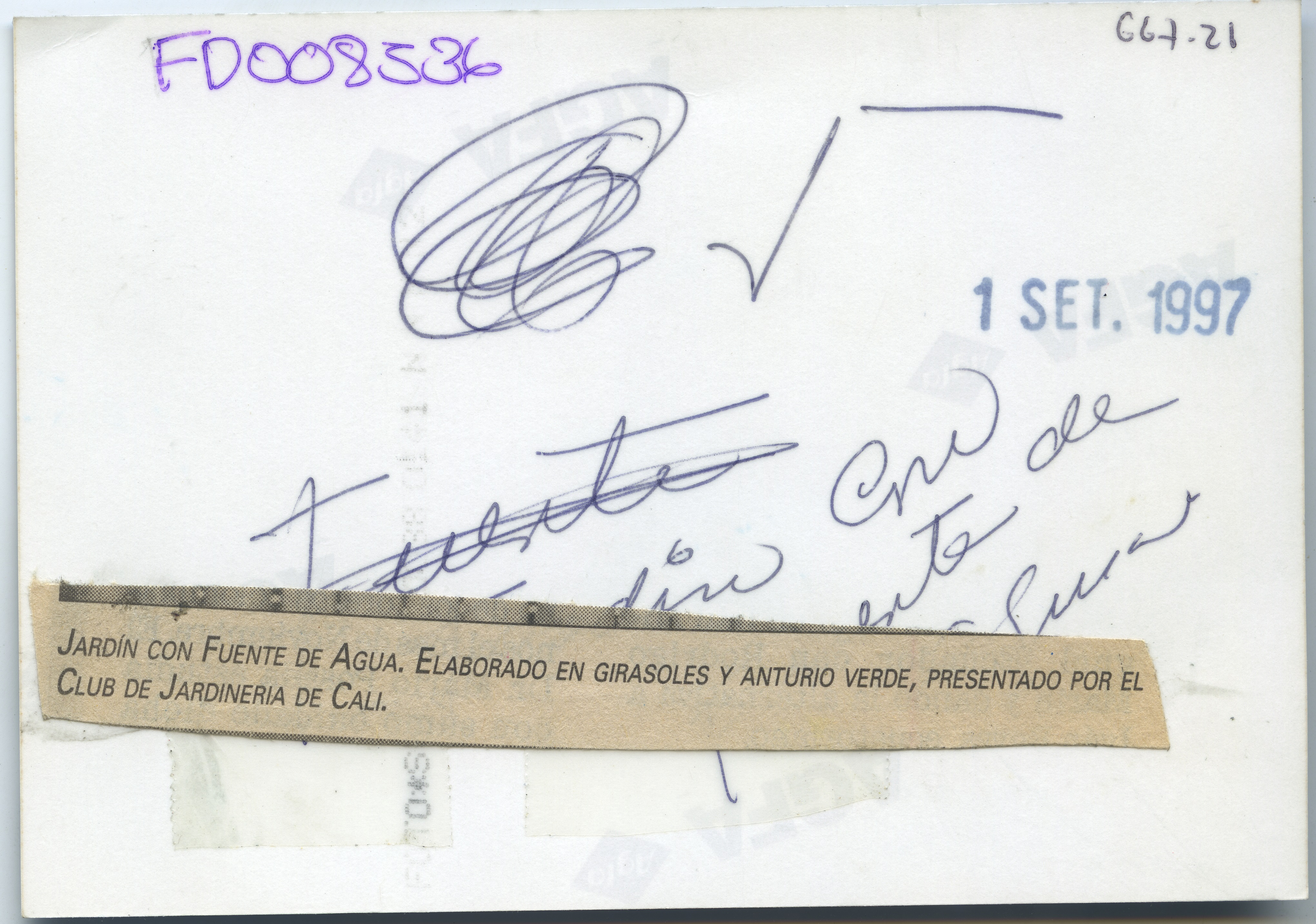 Al reverso de la fotografía se anexa recorte: "Jardín con fuente de agua. Elaborador en girasoles y anturio verde, presentado por el Club de Jardinería de Cali."