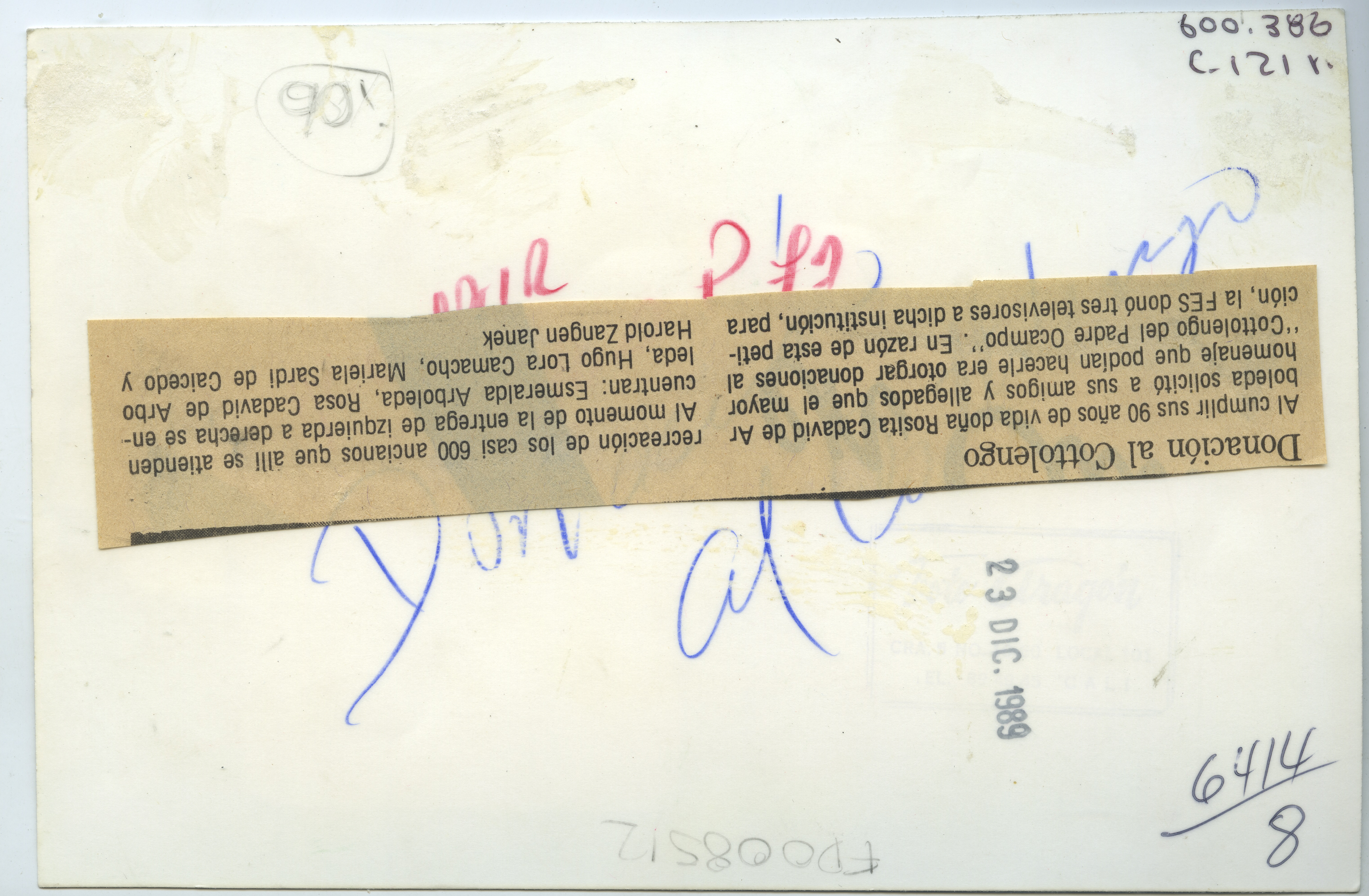 Al reverso de la fotografía se anexa recorte: "Donación al Cottolengo. Al cumplir sus 90 años de vida doña Rosita Cadavid de Arboleda solicitó a sus amigos y allegados que el mayor homenaje que podían hacerle era otorgar donaciones al "Cottolengo del Padre Ocampo". En razón de esta petición, la FES donó tres televisores a dicha institución, para recreación de los casi 600 ancianos que allí se atienden. Al momento de la entrega de izquierda a derecha se encuentran: Esmeralda Arboleda, Rosa Cadavid de Arboleda, Hugo Lora Camacho, Mariela Sardi de Caicedo y Harol Zangen Janek."