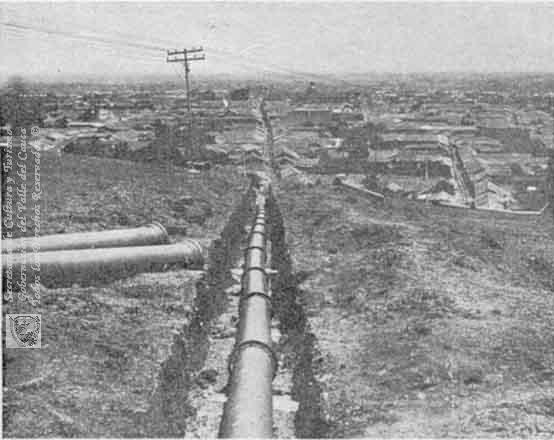 Colocación de tuberías del acueducto Metálico. Al fondo se observa la ciudad. Santiago de Cali, 1920