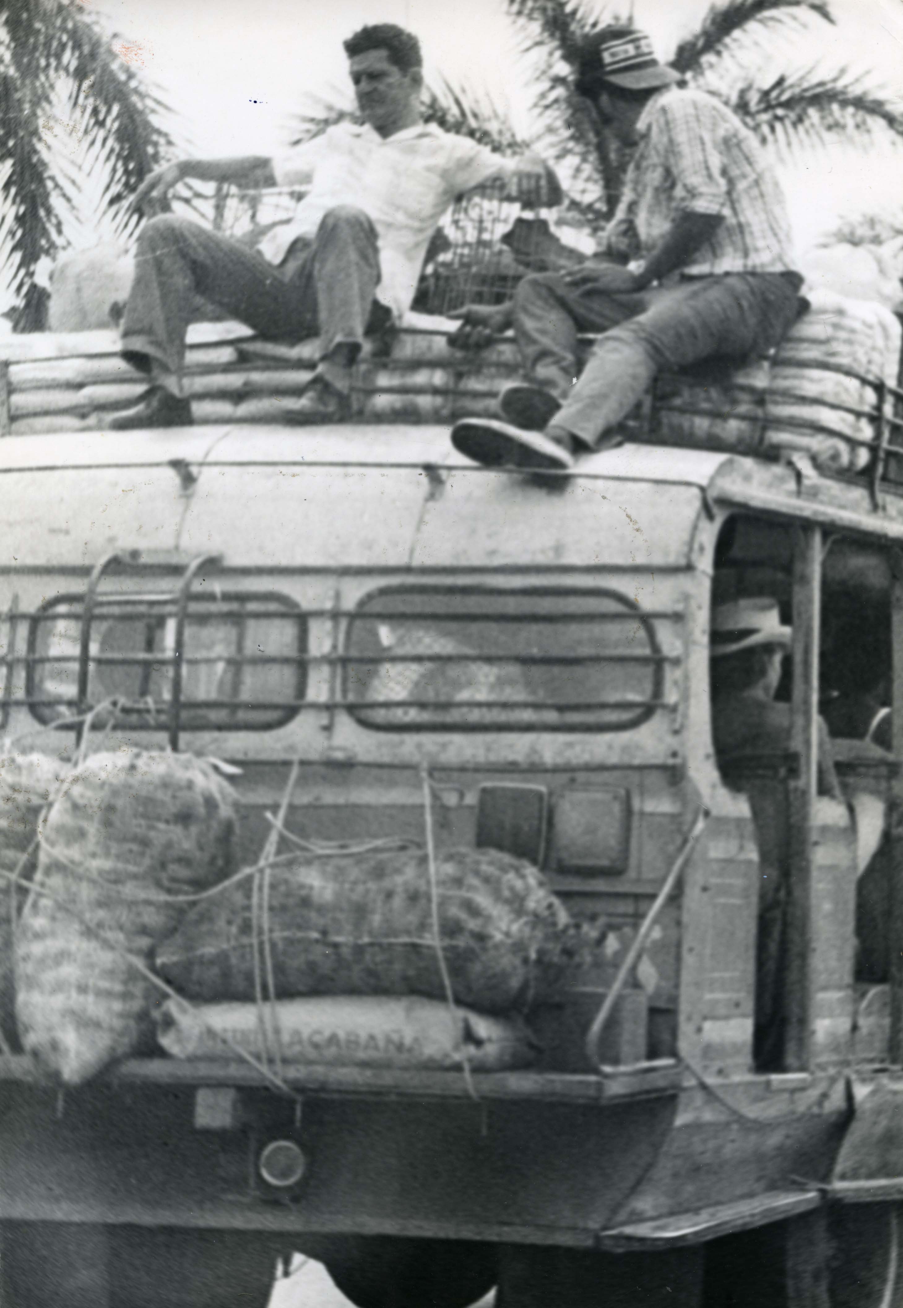 En esta fotografía podemos observar una chiva la cual cumple con la función de vehículo de carga y trasporte de pasajeros. Podemos ver dos personas en la parte superior del vehículo (esto es algo bastante frecuente y común en las Chivas)// El Archivo del Patrimonio Fotográfico y Fílmico del Valle del Cauca es responsabilidad de la Biblioteca Departamental del Valle Jorge Garcés Borrero, por convenio de cooperación suscrito con la Secretaria del Cultura Departamental, con el fin de aunar esfuerzos para su conservación, preservación y divulgación del Archivo entre la comunidad Vallecaucana, especialmente entre los estudiantes e investigadores que visitan la Biblioteca, propiciando el su uso y consulta permanente. La universidad Icesi es un colaborador en el proceso de difusión, facilitando la tecnología que permite la consulta de las imágenes.