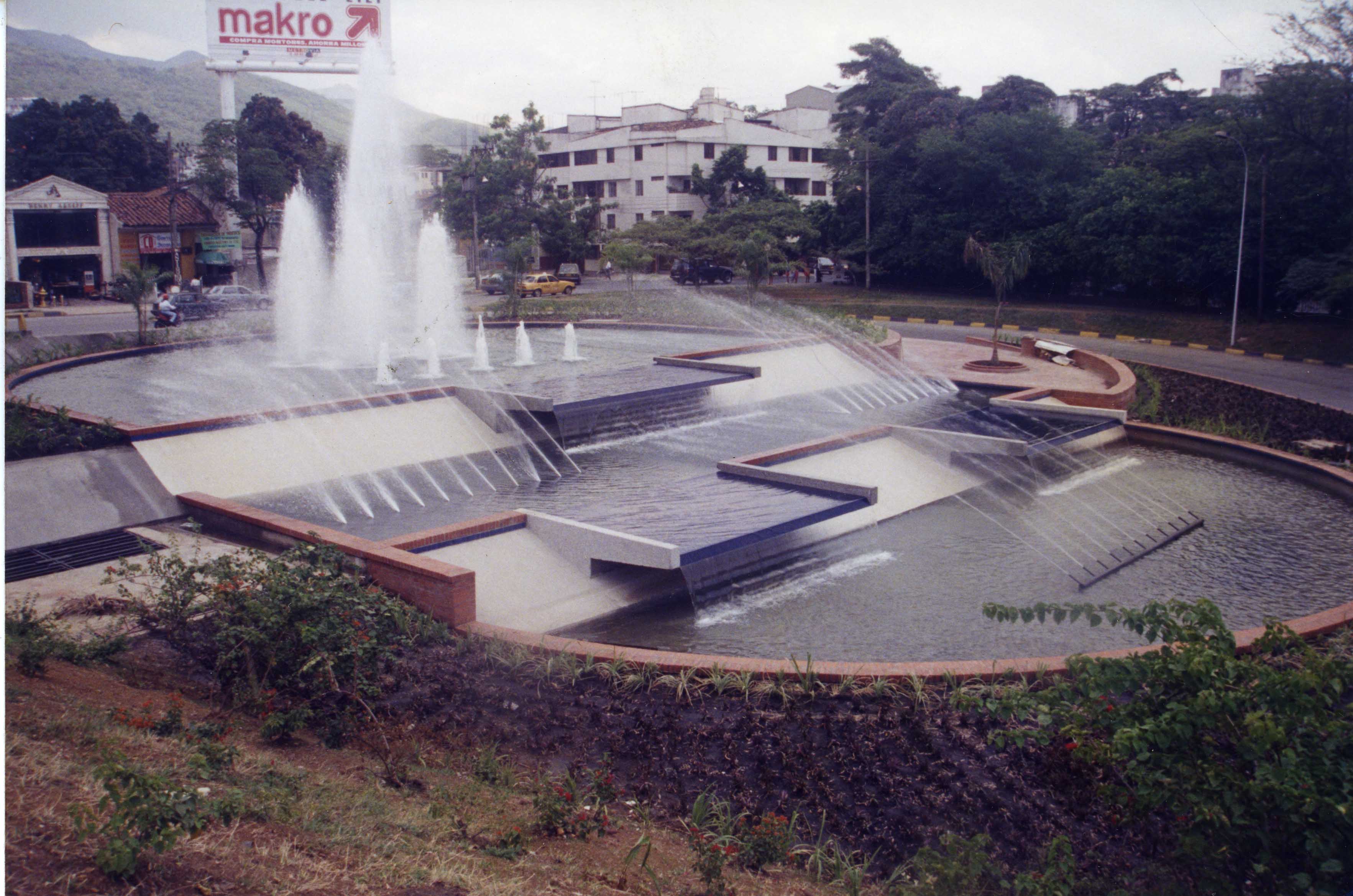 Fuente luminosa frente al Club Colombia, calle 15 y 16. Se aprecia la fuente, árboles, edificios, la montaña // El Archivo del Patrimonio Fotográfico y Fílmico del Valle del Cauca es responsabilidad de la Biblioteca Departamental del Valle Jorge Garcés Borrero, por convenio de cooperación suscrito con la Secretaria de Cultura Departamental, con el fin de aunar esfuerzos para su conservación, preservación y divulgación del Archivo entre la comunidad Vallecaucana, especialmente entre los estudiantes e investigadores que visitan la Biblioteca, propiciando el uso y consulta permanente. La universidad Icesi es un colaborador en el proceso de difusión, facilitando la tecnología que permite la consulta de las imágenes.