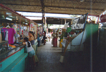 Plano general. Puestos de venta de ropa en el interior en la plaza de mercado del barrio Alfonso López. Interior día.