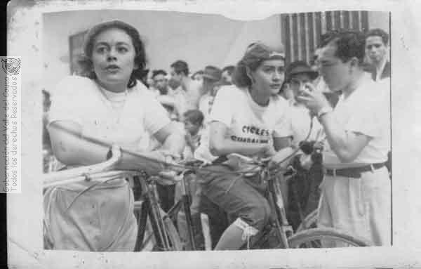 Carrera de triciclos y bicicletas. Se destaca la participación de la mujer en este tipo de actividad deportivo-recreativa. La actitud de la corredora con la clásica gorrita de ciclista, al ser entrevistada por un periodísta.