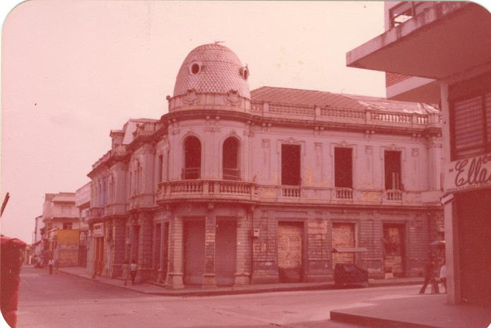 Edificio de la familia Restrepo, ubicado en la carrera 8ª con calle 12. En el primer piso funcionaba el almacen de los hermanos Restrepo y el segundo se utilizaba como casa de habitación. Este edificio fue destruído para hacer un parqueadero de autos y un centro de comidas Punto Rojo en su lugar. Santiago de Cali, 1977.