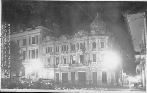 Foto nocturna de la Plaza de Caicedo. Al fondo edifico Otero. C. 1935