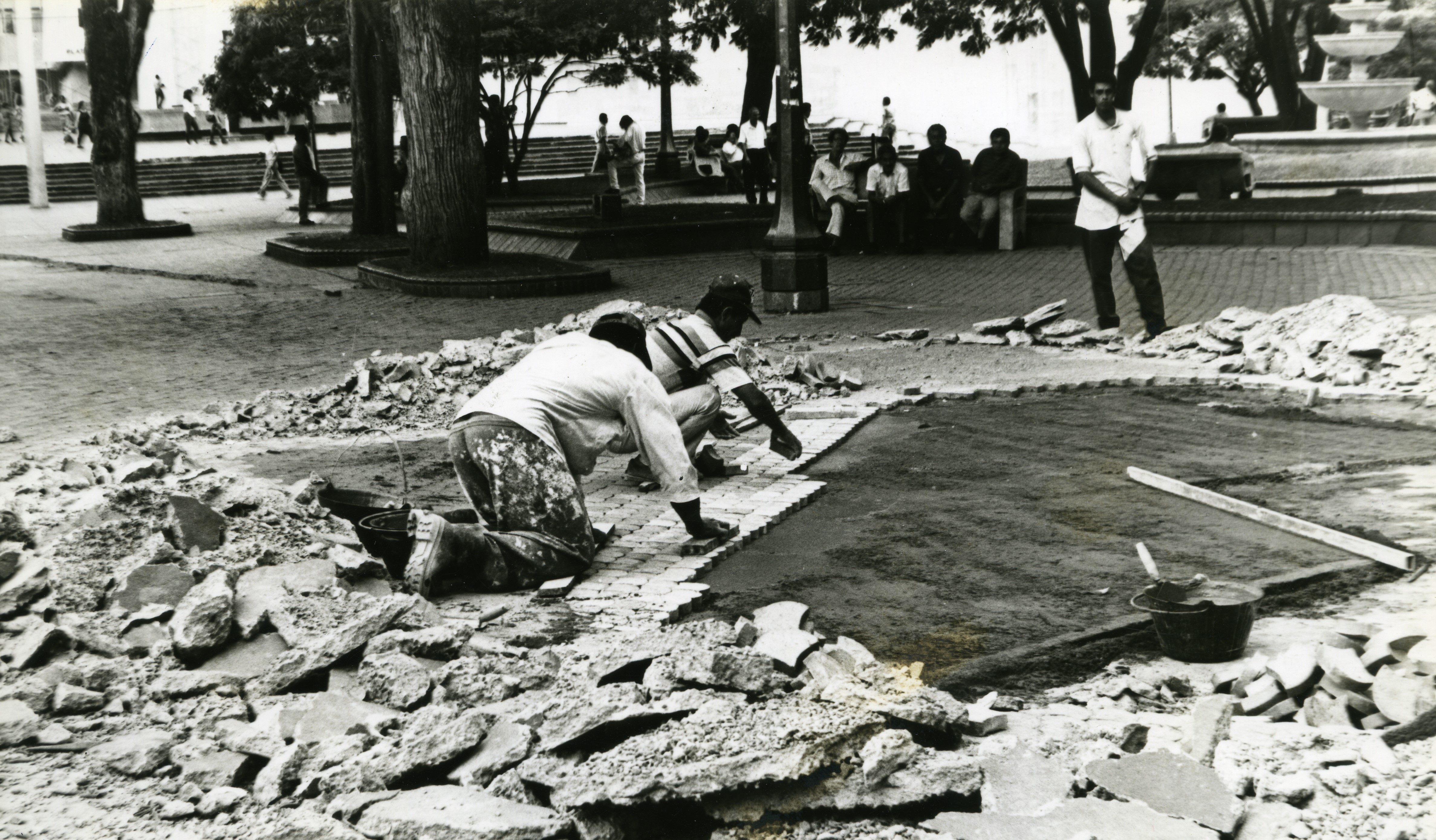 Al reverso de la fotografía se anexa un recorte:"LUEGO de una larga espera, los caleños podrán volver a ver en buen estado el paseo Bolívar y la Plazoleta del Cam, espacios que luego de que se ejecutarán los trabajos del colector marginal del río Cali, quedaran con baches en el sector adoquinado. Con la vuelta a la normalidad de la zona y las medidas tomadas por la administración de sacar los vendedores ambulantes, la ciudad recupera uno de sus más tradicionales espacios públicos".