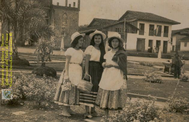 Damas vestidas para una presentación de danzas. Parque principal de Restrepo, 1951.