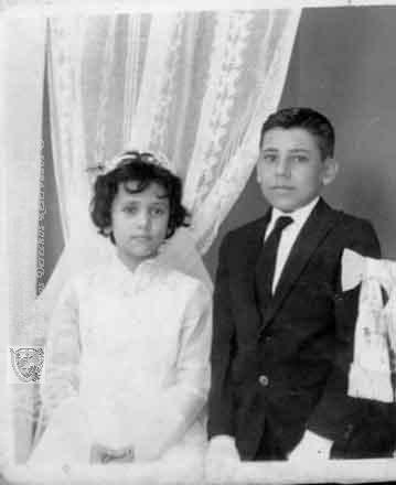 Primera comunión de los hermanos Bedoya.Los guantes, moños y velos femeninos, indumentaria fundamental hasta los años setenta, son hoy un recuerdo de fotografía. fecha por identificar.