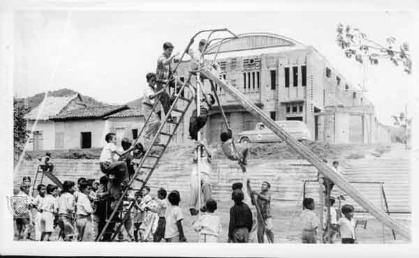 GERARDO CASTRO (1954). Niños jugando en un resbaladero en el parque infantil frente al Teatro Municipal & 100779. TORO: Biblioteca Departamental Jorge Garces Borrero.