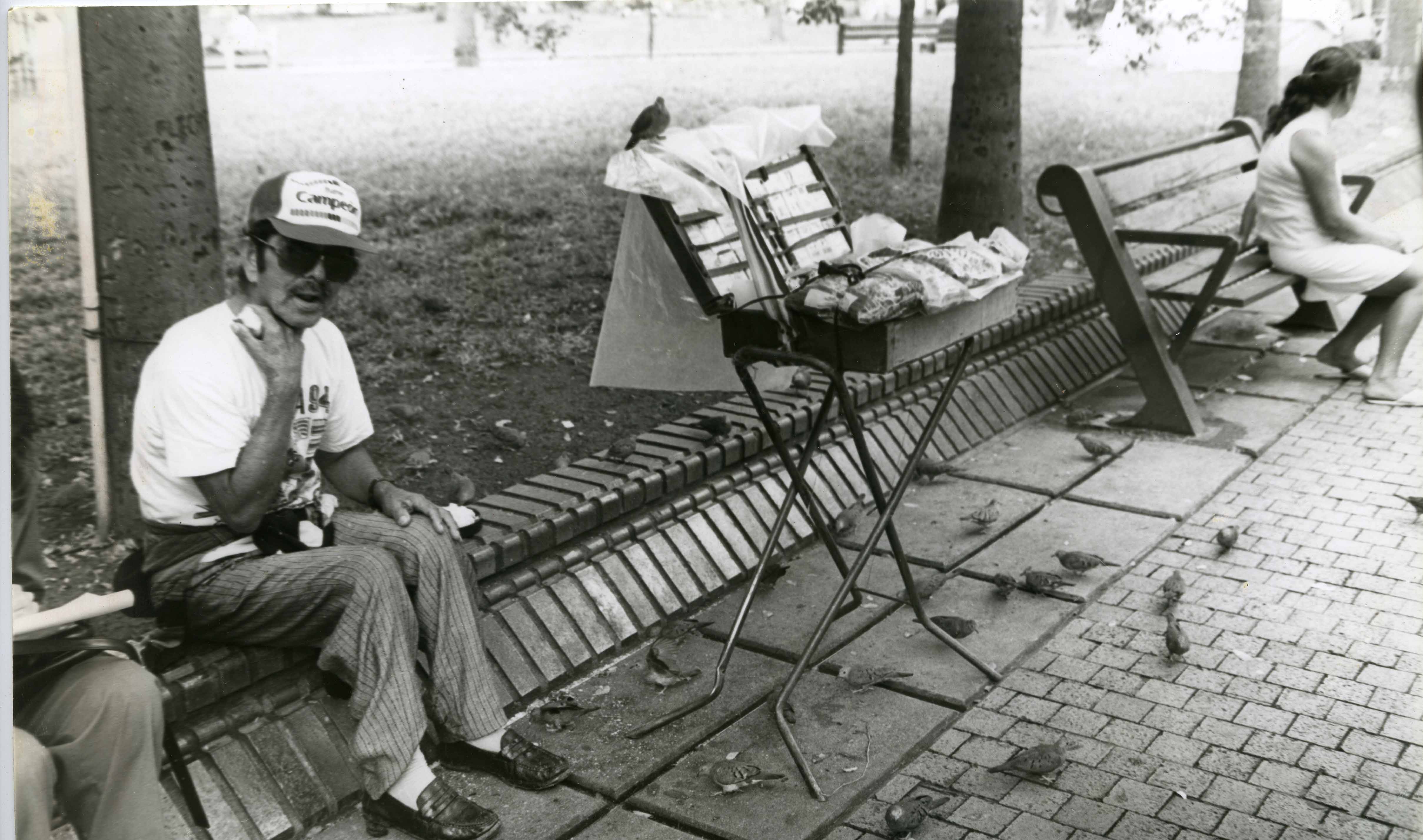 Al reverso de la fotografía se anexa recorte: " Desde hace 15 años Benjamín Aldana vende dulces en la Plaza Cayzedo. Sus días pasan lentamente acompañado de las torcacitas que son como sus hijos, sus compañeros fieles."