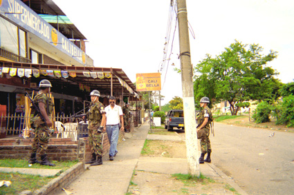 Plano General. Se aprecia al costado derecho una vía vehicular pavimentada. Al extremo izquierdo la fachada de varias viviendas, y en una de ellas un local comercial y tres soldados que patrullan el sector.