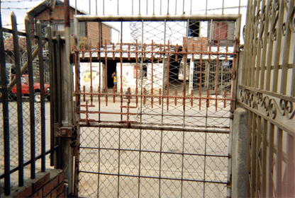 Reja que comunica y divide el barrio Villa del Lago con Charco Azul. Plano general.