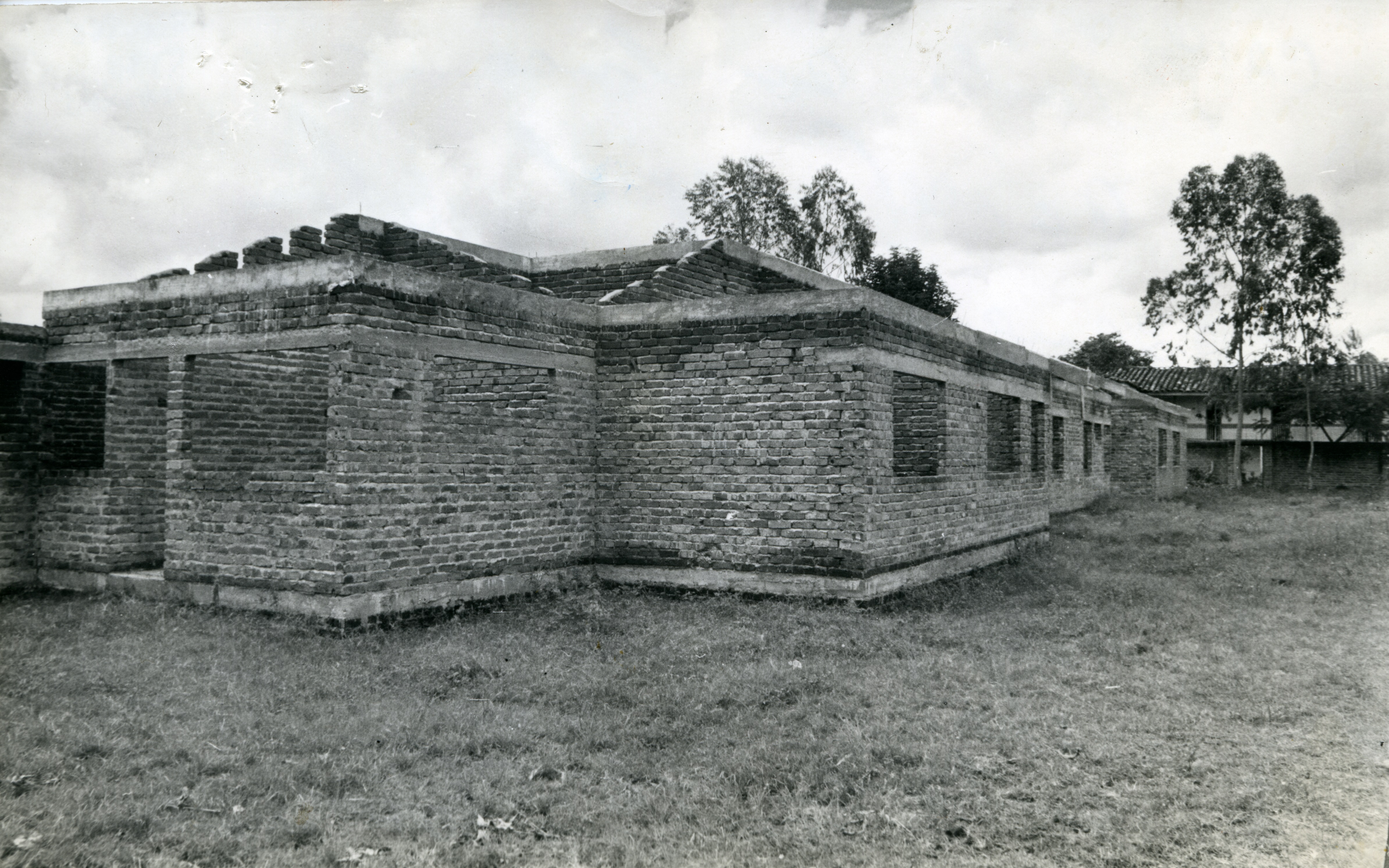 En la fotografía se observa la construcción de un inmueble que al parecer será destinado para la Cárcel Municipal pero su construcción se encuentra parada. Al reverso dice: ¨Entrada de construcción Cárcel Mpal., obras que… (texto ilegible) contiguo al cementerio. Foto donada por el Mpio.¨