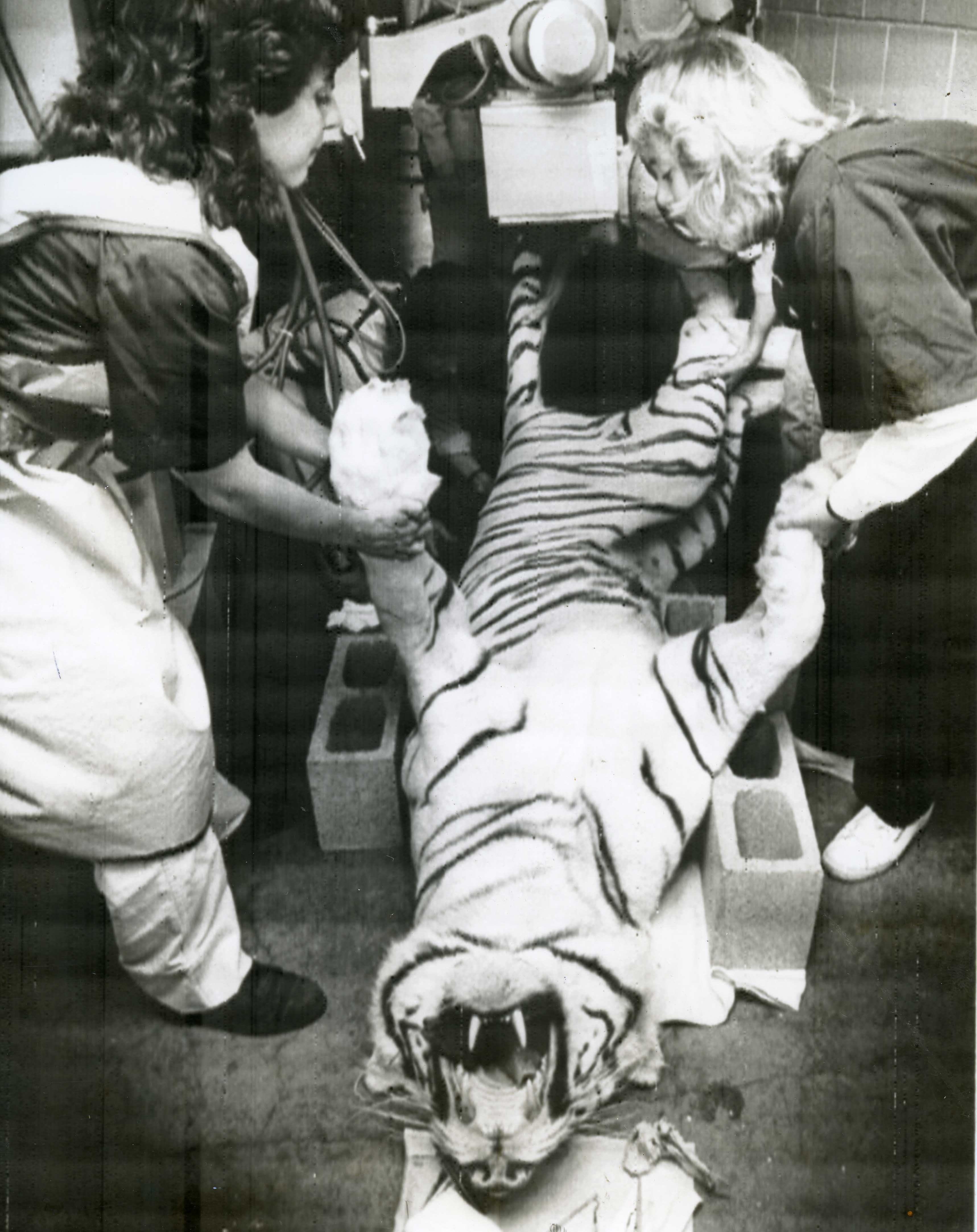 Zoológico de Cali, Valle del Cauca. Un tigre blanco de bengala es colocado para una radiografía de rayos x, como parte de un examen médico // El Archivo del Patrimonio Fotográfico y Fílmico del Valle del Cauca es responsabilidad de la Biblioteca Departamental del Valle Jorge Garcés Borrero, por convenio de cooperación suscrito con la Secretaria de Cultura Departamental, con el fin de aunar esfuerzos para su conservación, preservación y divulgación del Archivo entre la comunidad Vallecaucana, especialmente entre los estudiantes e investigadores que visitan la Biblioteca, propiciando el su uso y consulta permanente. La universidad Icesi es un colaborador en el proceso de difusión, facilitando la tecnología que permite la consulta de las imágenes.